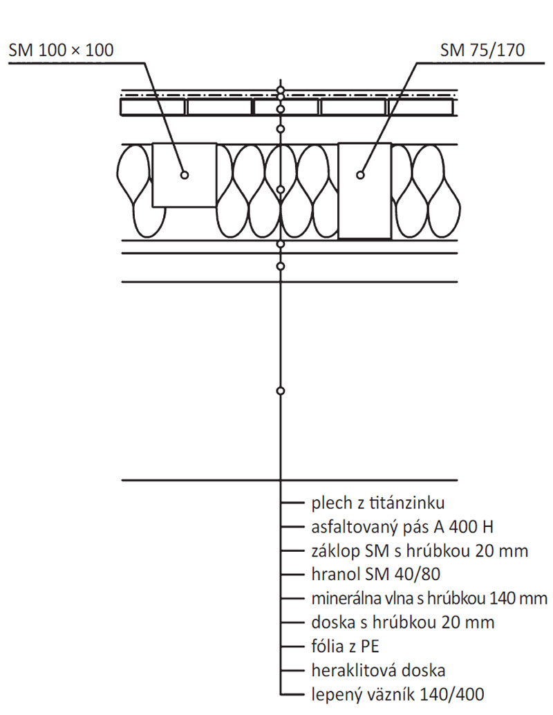 Drevený rošt na doskový záklop pod strešnou krytinou je osadený na hranoloch SM 10/10 a na hornej ploche dreveného priečnika tvoreného hranolom SM 75/170. Drevený priečnik je osadený medzi jednotlivými drevenými lepenými väzníkmi pomocou oceľového strmeňa zinkovaného vyrobeného zo zliatiny FeZn (železo – zinok). Šírku vzduchovej medzery 40 mm pod záklopom určuje drevený rošt. Vzduchovú medzeru možno vzhľadom na nízky sklon strechy a veľké rozpätie kvalifikovať ako nevetranú alebo zle vetranú. Strecha tak v podstate fungovala ako jednoplášťová konštrukcia (obr. 5).