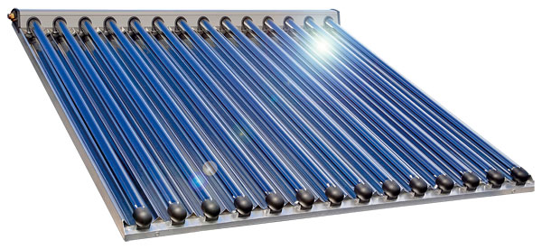 - Vákuové kolektory – majú dvojstenné sklenené vákuové trubice s vloženým medeným potrubím, kde prúdi tepelná kvapalina. Selektívna absorbčná vrstva sa tvorí na vnútornej strane sklenenej trubice. Na maximálne využitie žiarenia je za vákuovou trubicou parabolické odrazové zrkadlo. Dokonalú izolačnú ochranu vysokej teploty v medených rúrkach tvorí vákuum. Ide o kolektory s vyššou účinnosťou v prechodnom a zimnom období. Využívajú sa na ohrev vody aj na podporu vykurovania.