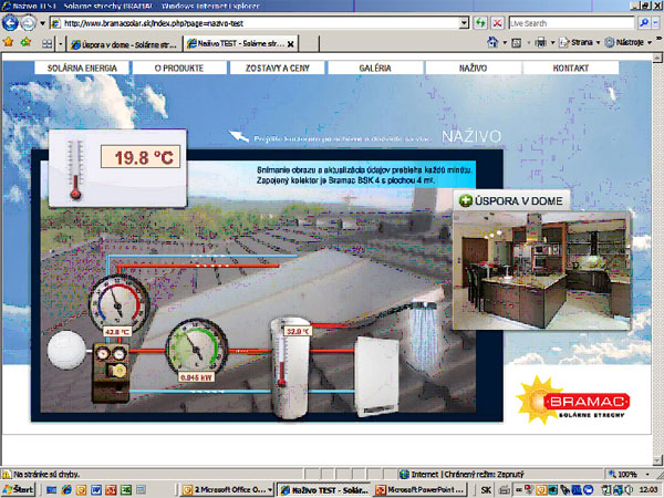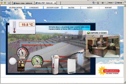 Solárne strechy sú na Slovensku ešte stále akousi novinkou. Z tohto dôvodu chceme najväčšiu pozornosť upriamiť na sekciu NAŽIVO. Tá je najnázornejšou ukážkou toho, ako vaša strecha transformuje solárne žiarenie v reálnu energiu na okamžitú prevádzku vášho domu. Údaje do sekcie prichádzajú na stránku reálne v konkrétnom momente cez monitorovacie zariadenia, ktoré sú namontované v dome so Solárnou strechou Bramac. Rodinný dom sa nachádza v Žiranoch, na ktorého streche je použitý solárny kolektor BSK4. Názorné zobrazenie celého solárneho mechanizmu vám jednoduchou formou vysvetľuje, ako to celé funguje – od kolektora až po kotol. Animácia súčasne vysvetľuje, ako solárna energia šetrí vaše financie a čas v jednotlivých miestnostiach domu.