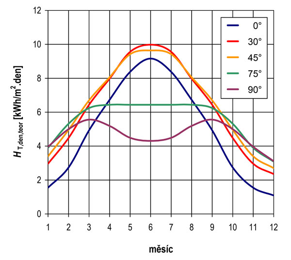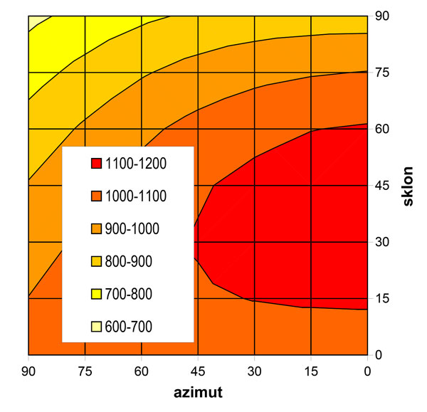 Vzhľadom na odlišné klimatické podmienky a rôzne úrovne dopadajúcej slnečnej energie sa bude v rôznych lokalitách a rôznych rokoch hodnota využitých tepelných ziskov solárnej sústavy líšiť. Na základe využiteľných tepelných ziskov zo slnečnej energie dopadajúcej v mieste inštalácie na plochu kolektorov sa stanoví celková účinnosť solárnej sústavy. Účinnosť solárnych kolektorov závisí aj od ich orientácie a sklonu (optimálne 45° na účely prípravy teplej vody). Porovnanie rozličných orientácií a uhlov sklonu vidieť na obr. 1.