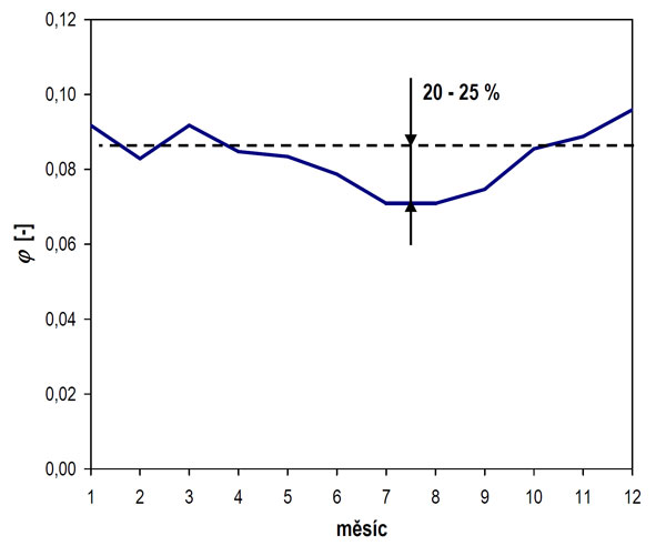 | Obr. 2 Ročný merný profil spotreby teplej vody na bytové domy (percentuálne rozloženie) | Obr. 3 Priebeh teoreticky využiteľných tepelných ziskov a skutočne využitých ziskov solárnej sústavy na prípravu teplej vody pri rôznom solárnom pokrytí (orientačný príklad) |