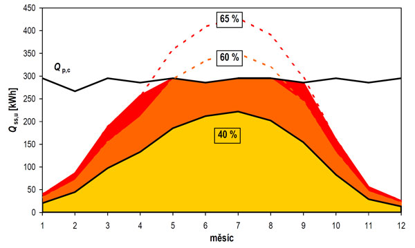 Na obr. 3 je znázornená bilancia solárnej sústavy na prípravu teplej vody s rôznym pokrytím potreby tepla. Z grafu je zrejmé, ako vplyvom predimenzovanej plochy výrazne rastú letné nevyužiteľné prebytky, zatiaľ čo zodpovedajúce pokrytie už tak výrazne nerastie.