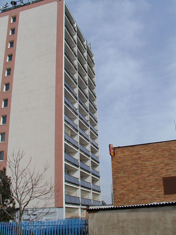 V solárnej sústave sa využilo 36 solárnych kolektorov typu Eurosol – FA, ktoré sú umiestnené na zábradlí lodžií na južnej strane objektu. Ostatné zariadenie je umiestnené v suteréne objektu, kde sa nachádzajú výmenník tepla, zásobníky s objemom 2,5 m3 na ohrev vody na vykurovanie a 2 m3 na prípravu teplej vody, ďalej expanzívne a poistné zariadenie, obehové čerpadlá a regulácia sústavy.