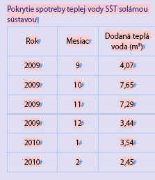V septembri minulého roka sa zaviedlo meranie krytia spotreby teplej vody solárnou sústavou, pričom celková potreba teplej vody pre kuchyňu, administratívnu budovu a sprchy je asi 80 m3.