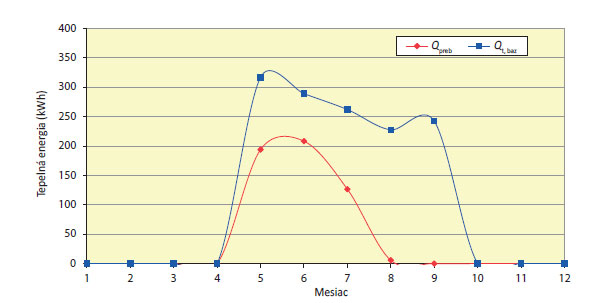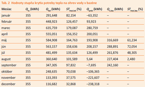 V tab. 2 sú uvedené hodnoty tepla potrebného na prípravu TV, množstva tepla získaného kolektorom s absorpčnou plochou 10,56 m2, stupňa krytia danej potreby TV a hodnoty prebytkov tepla zo solárnej sústavy počas celého roka. V posledných stĺpcoch sú uvedené vypočítané hodnoty tepla potrebného na ohrev vody v bazéne v rámci zvolenej kúpacej sezóny a stupňa krytia prebytočným teplom zo solárnych kolektorov. Hodnoty tepla potrebného na ohrev bazénovej vody sú upravené na jednotky korešpondujúce s jednotkami vypočítaného množstva tepla získaného kolektorom podľa času slnečného svitu. Na lepšiu názornosť a predstavu o pokrytí požadovaných potrieb sú jednotlivé údaje spracované aj graficky na obr. 1 a 2.