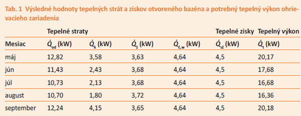 Podrobné spracovanie údajov a empirických vzťahov pri tepelnej bilancii bazéna je uvedené v [3] a [4]. V tab. 1 sú výsledné hodnoty všetkých tepelných strát a ziskov v rámci zvolenej kúpacej sezóny aj s uvedenou hodnotou potrebného tepelného výkonu.