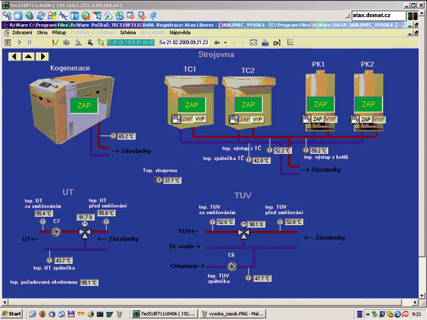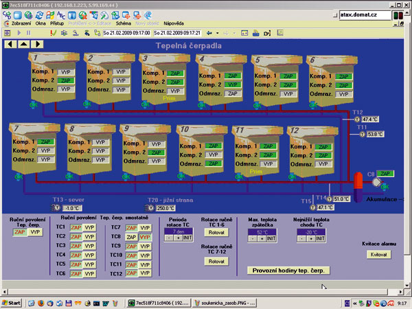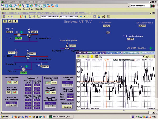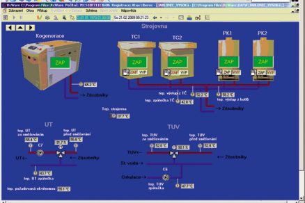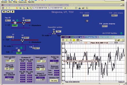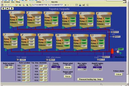 Diaľkový prístup k tepelným čerpadlám a odberom TV Grafika centrálneho dispečingu s distribučnými okruhmi a priebehom teploty TV
