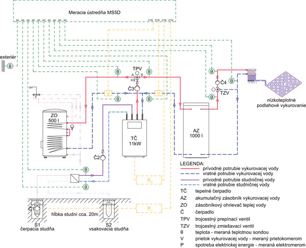 Objekt rodinného domu (realizovaný v roku 2008) má jedno nadzemné podlažie s úžitkovou plochou 151 m2 a nie je podpivničený. V rodinnom dome žije 6 osôb – 2 dospelé osoby a 4 deti vo veku od 6 do 12 rokov. Výpočtová tepelná strata objektu je 8,7 kW. V rodinnom dome je ako monovalentný zdroj tepla na vykurovanie a prípravu teplej vody inštalované tepelné čerpadlo typu voda – voda s celkovým vykurovacím výkonom 11 kW. Tepelné čerpadlo je zásobované podzemnou vodou systémom dvoch studní – čerpacej a vsakovacej studne s hĺbkou oboch studní 20 m. Tepelné čerpadlo je v činnosti už tretiu vykurovaciu sezónu. Vykurovací systém vo všetkých miestnostiach rodinného domu tvorí nízkoteplotné podlahové vykurovanie regulované ekvitermnou reguláciou na zdroji tepla. Zapojenie tepelného čerpadla do vykurovacieho systému je cez akumulačný zásobník vykurovacej vody (AZ) s objemom 1 000 litrov, ktorý je napojený cez rýchlomontážnu súpravu s trojcestným zmiešavacím ventilom na okruh rozdeľovača a zberača podlahového vykurovania. Príprava teplej vody sa realizuje prostredníctvom zásobníkového ohrievača vody (ZO) s objemom 500 litrov, ktorý je napojený cez trojcestný prepínací ventil na okruh tepelného čerpadla. Schéma zapojenia zdroja tepla a vykurovacieho systému s prípravou teplej vody, ako aj meracie body a merané fyzikálne veličiny sú schematicky znázornené na obr. 1.