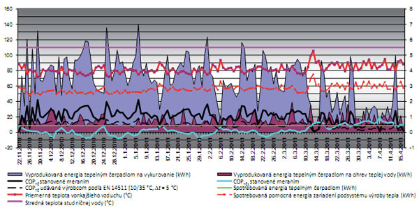 Na grafe priebehu teplôt vykurovacej vody pri jednotlivých prevádzkových režimoch sa preukázal výrazný vplyv teploty a teplotného spádu vykurovacej vody na dosahovanú hodnotu výkonového čísla COPTČ. Analyzovaním výsledkov sa zistilo a potvrdilo, že pri vyššej teplote vykurovacej vody je vhodnejší väčší teplotný spád na dosiahnutie vyššieho výkonového čísla (pri teplotnom spáde 48,6/38,7 °C bolo COPTČ = 4,6 a pri teplotnom spáde 48,6/43,2 °C bolo COPTČ = 2,7). Dôvodom je množstvo vyprodukovaného tepla tepelným čerpadlom, ktoré je pri väčšom teplotnom spáde väčšie a v lepšom pomere k spotrebovanej elektrickej energii než pri vyššej teplote a nižšom teplotnom spáde vykurovacej vody.