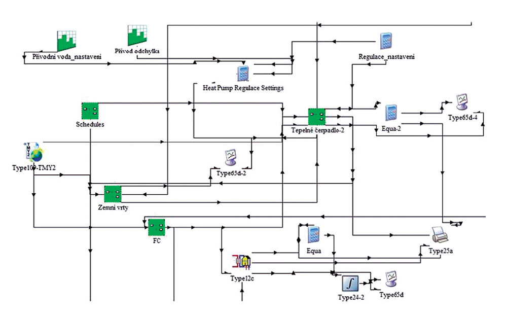 TRNSYS je softvér, ktorý sa používa na dynamickú analýzu energetických systémov budov. Obsahuje širokú ponuku komponentov – od základných ohrievačov až po reguláciu a zostavenie detailného modelu budovy [3]. Vo všetkých troch prípadoch simulácie sa použil rovnaký základ. Hlavnými komponentmi všetkých systémov boli zemný výmenník tepla, tepelné čerpadlo s akumulačnou nádržou, zariadenie na rozvod tepla pomocou fancoilov a samotná budova.Prevádzka tepelného čerpadla nebola invertorová, ale kompresor pracoval na princípe ON/OFF na základe nastaveného rozsahu teplôt. Elektronický regulátor meral teplotu vratnej vody na vstupe do tepelného čerpadla a zaisťoval udržiavanie teploty vratnej vody v určitom východiskovom teplotnom rozsahu. Ak teplota vratnej vody prekročila hornú hranicu nastaveného rozpätia teplôt, kompresor tepelného čerpadla sa zastavil. Ak po vypnutí kompresora teplota znova poklesla a dosiahla spodnú hranicu rozsahu, kompresor sa znova spustil.Simuláciou sa sledovalo správanie systému počas jedného roka s časovým krokom 1 hodina.