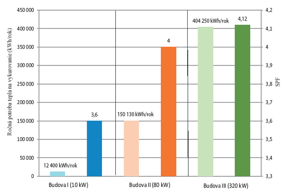 Cieľom simulácie bolo porovnať účinnosť systémov s vrtmi geotermálnych tepelných čerpadiel pri troch rôznych veľkostiach budov. Parametrom hodnotenia efektivity bolo sezónne výkonové číslo SPF, na ktorého výpočet existuje v súčasnosti niekoľko metód. Norma ČSN EN 15316-4-2: 2006 Tepelné systémy v budovách: Výpočtová metóda na stanovenie energetickej potreby a účinnosti sústavy udáva dva spôsoby výpočtu SPF. Prvým je zjednodušená metóda založená na typológii systému, druhým je výpočet podľa tzv. intervalovej metódy. Výpočet je rozdelený na jednotlivé intervaly, ktoré závisia od teploty vonkajšieho vzduchu. Ďalší návod na výpočet sezónneho výkonového čísla poskytuje norma VDI 4650. V tomto prípade sa SPF vypočítalo ako priemerná hodnota z vykurovacích súčiniteľov, ktoré sa počítali v jednotlivých časových krokoch, keď bol kompresor tepelného čerpadla v prevádzke. Do výpočtu SPF sa nezahrnul príkon obehových čerpadiel a ďalších pomocných komponentov. Veľkosť SPF ovplyvňuje najmä teplota na vstupe do tepelného čerpadla (množstvo tepla získané zo zeminy) a teplota vody na výstupe z tepelného čerpadla (teplota vody vo vykurovacom okruhu).Prvý výsledok (obr. 2) ukazuje porovnanie SPF troch hodnotených objektov v závislosti od ich tepelnej straty – je zreteľný nárast SPF s rastúcou tepelnou stratou. Rodinný dom má najnižšie SPF na úrovni 3,6. Celkovú spotrebu elektrickej energie teda získame vydelením ročnej potreby tepla na vykurovanie koeficientom 3,6. Budova II vykazuje oproti rodinnému domu rast SPF o 10 %. Tretia, najvyššia, budova dosahuje SPF 4,12. Na obr. 2 vidieť opäť rovnakú závislosť, ale v porovnaní s ročnou potrebou tepla na vykurovanie. Veľkosť budovy a jej tepelná strata sa teda javia ako parametre, ktoré je dobré vziať do úvahy pri rozhodovaní o systéme geotermálneho tepelného čerpadla ako zdroja tepla. Pri menších domoch, alebo dokonca pri veľmi dobre izolovaných pasívnych domoch nie je, paradoxne, systém s vrtmi na využívanie geotermálnej energie pomocou tepelného čerpadla natoľko efektívny. Tieto budovy majú len veľmi nízku potrebu tepla a úspory energie pri prevode na spotrebu primárnej energie nie sú také významné.Väčšia budova s väčšou potrebou tepla spotrebuje omnoho viac energie. Potenciál využitia geotermálnej energie a úspora energie na vykurovanie sú tak v porovnaní s inými zdrojmi tepla omnoho vyššie. Pri väčších občianskych budovách sa v lete pre tepelné zisky vyžaduje aj chladenie, ktoré sa môže zabezpečovať tým istým systémom, čím sa vyrieši aj využitie vrtov v letnom období.