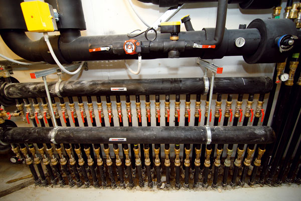 | Zberač a rozdeľovač zemných sond | Cirkulačné čerpadlá na aktiváciu betónového jadra (2 ks vpravo) a podlahové vykurovanie (2 ks vľavo) |