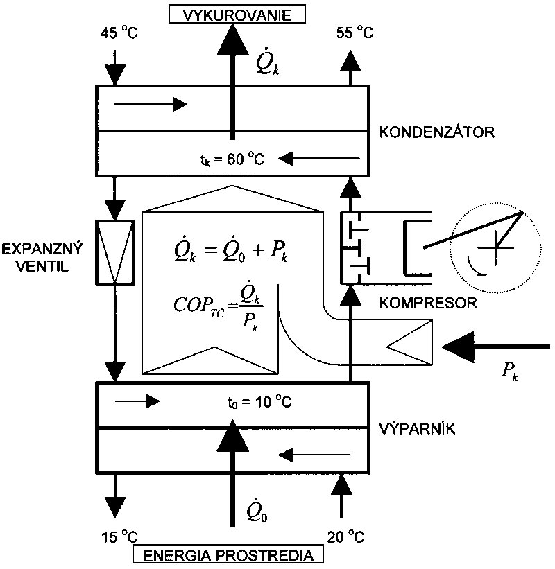 Na porovnanie uvedených dvoch technológií výroby tepla z hľadiska dosiahnuteľnej energetickej efektívnosti sa musí vziať do úvahy, že pre tepelné čerpadlá projektované do nových nevýrobných budov netreba realizovať alternatívny klasický spôsob výroby tepla. Tepelné čerpadlá sú teda schopné energeticky efektívne zabezpečiť celoročnú potrebu tepla na vykurovanie a prípravu teplej vody (TV), samozrejme, za predpokladu realizácie veľkoplošných vykurovacích systémov s teplotnou úrovňou vykurovacieho média 35 až 45 °C. Tepelné čerpadlá možno použiť aj v letných mesiacoch na výrobu chladu (napríklad pomocou reverzného chladiaceho obehu na účely klimatizácie a teplovzdušného vykurovania pomocou spätného získavania tepla z vetracieho vzduchu), možno ich teda využívať v celoročnej prevádzke. Ilustračná schéma znázorňujúca hlavné komponenty a funkciu obehu kompresorového tepelného čerpadla je na obr. 1.