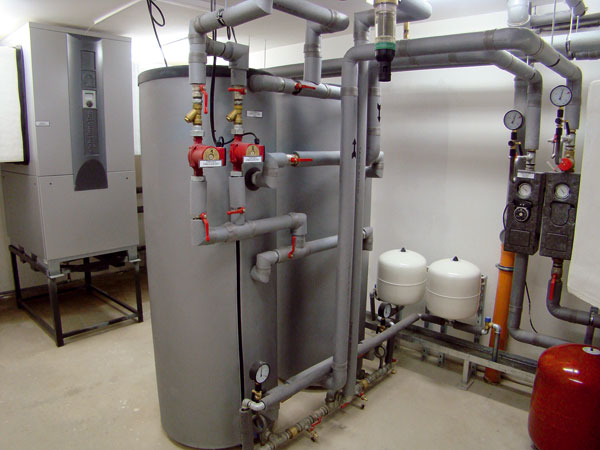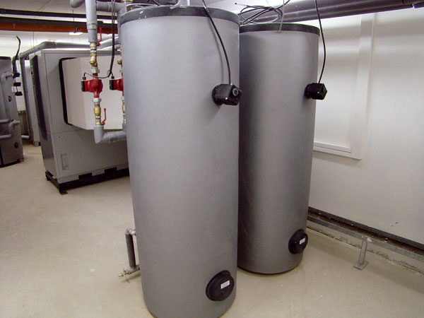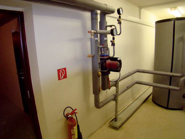 Teplo z kaskády troch tepelných čerpadiel sa privádza do špeciálneho vrstveného oddeľovacieho zásobníka TPS800 s objemom 800 litrov. Tu sa nachádzajú aj telesá na dohrievanie, riadené reguláciou tepelných čerpadiel. Každá strojovňa má aj dva zásobníky teplej vody (TV) s objemom po 500 litrov. Regulácia tepelných čerpadiel obsahuje ekvitermnú reguláciu vykurovania, takže teplo z oddeľovacieho zásobníka sa priamo distribuuje do budovy pomocou obehového čerpadla cez stúpacie potrubia a rozdeľovacie stanice. Na všetkých vykurovacích telesách sú termostatické hlavice.
