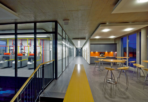Primárnym materiálom a princípom stavby je sklo a jeho transparentnosť. Budova má otvorenú dvojpodlažnú vstupnú halu, zasklené priehľady do všetkých priestorov, zasklené ukončenia priečok a veľkoplošnú kanceláriu. Kontrastom k transparentnosti skla sú povrchy stien, stĺpov a stropu z pohľadového betónu bez omietky.