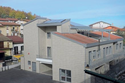 V talianskej obci San Sossio Baronia sa rozhodli zrenovovať miestnu materskú školu v štýle energetickej sebestačnosti. Ide o trojpodlažnú budovu (cca 400 m²). Prvé podlažie tvorí telocvičňa, druhé detská herňa, jedáleň, spálňa a kancelárie. V podkroví sa nachádza byt správcu budovy. V roku 2016 budovu zateplili a na rad prišla renovácia vykurovania. Ide o dve tepelné čerpadlá značky Vaillant (každé 15 kW), solárny systém a kondenzačný kotol (46 kW), ktoré spolupracujú s akumulačným zásobníkom Vaillant allSTOR exclusive (1 500 l). Ten funguje ako tepelná centrála pre vrstvené ukladanie energie z rôznych zdrojov, na vykurovanie i prípravu teplej vody. Tepelné čerpadlá flexoTHERM exclusive zem/voda získavajú energiu z geotermálnych vrtov s hĺbkou 98 m. Solárny systém tvoria štyri solárne panely typu drain-back. Už rok po renovácii došlo k zníženiu prevádzkových nákladov materskej školy takmer o 50 %.