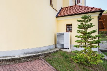 Monoblokové tepelné čerpadlo vzduch/voda pri bočnom múre pútnického kostola v Skalke
