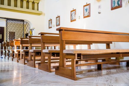 Radiátory pod novými stoličkami pri oltári v pútnickom kostole v Skalke