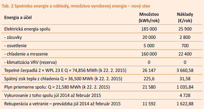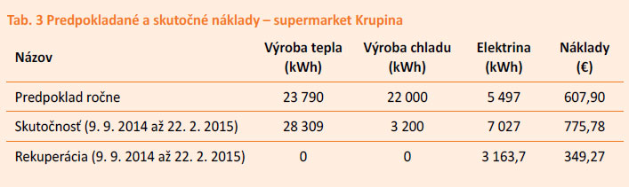 yrobené teplo z chladiacich a mraziacich zariadení sa až do tejto zmeny riešenia vyhadzovalo ako nevyužiteľné. Podľa informácie chladiarenskej firmy to predstavovalo výkon 19 kW, ktoré museli utrácať vo vonkajšom vzduchu v kondenzačnej jednotke. Dnes sa odoberá všetko teplo s vyššou teplotou ako teplota späť a von odchádza len to, čo sa už nedá spotrebovať. Tak sa pomáha aj chladiarenskej prevádzke – už raz vyrobené teplo sa rekuperuje a nevyhadzuje.