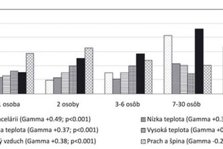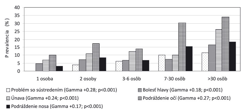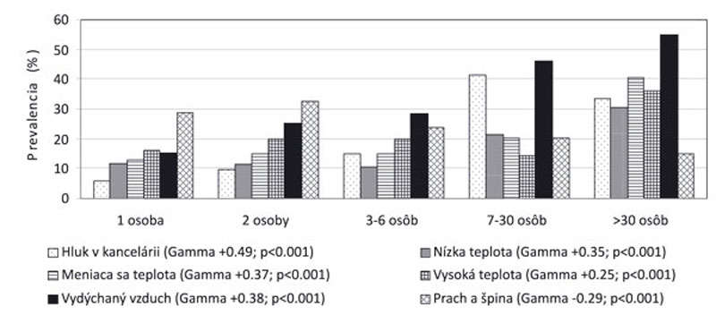 Na obr. 1 sú vybrané skúmané fyzikálne faktory v prostredí kancelárií a na obr. 2 sú vybrané symptómy. Grafy zobrazujú prevalenciu sťažností na dané faktory a symptómy, ktoré sa vyskytujú v priestoroch denne alebo niekoľkokrát za týždeň. Vybrali sa faktory a symptómy, ktorých vysoký pozitívny Gamma koeficient poukazuje na ich výrazne sa zvyšujúci výskyt so zväčšujúcou sa veľkosťou kancelárií a výsledná p-hodnota logistickej regresie poukazuje na štatisticky významné rozdiely v prevalencii v rôznych veľkostiach kancelárií. Jediný faktor vo vnútornom prostredí kancelárií s vysoko negatívnym Gamma koeficientom je „prach a špina“. Na obr. 1 možno vidieť, že prevalencia výskytu tohto faktora klesala so vzrastajúcou veľkosťou kancelárií.
