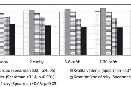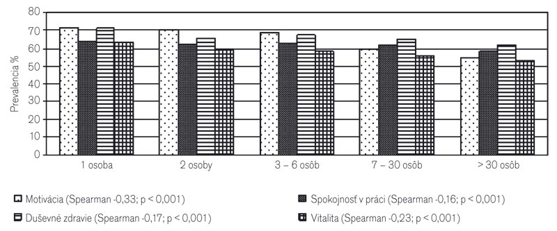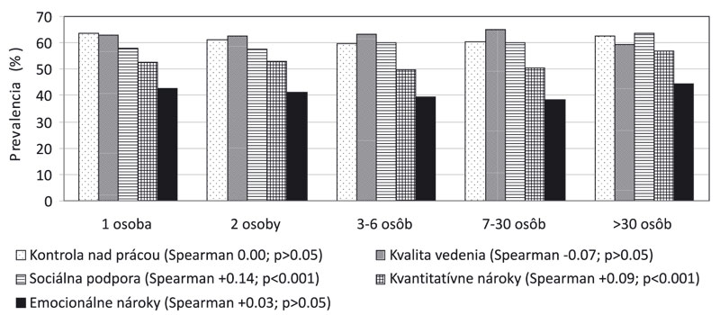 Výsledky hodnotenia psychosociálnych parametrov na pracoviskách, pri ktorých sa nezistila asociácia s veľkosťou kancelárií, sú na obr. 3. Uvedené psychosociálne parametre sa s meniacou sa veľkosťou kancelárií menia iba málo a okrem parametra „sociálna podpora“ aj štatisticky nevýznamne.