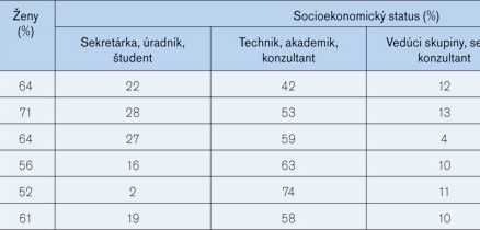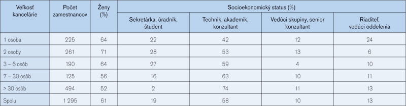 Tab. 1: Distribúcia zamestnancov, zastúpenie ženského pohlavia a socioekonomického statusu v kanceláriách rôznej veľkosti