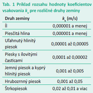 V tab. 1 je uvedený prehľad koeficientov vsakovania podľa veľmi všeobecného zatriedenia zemín. Tabuľka nenahrádza geologickú rešerš ani geologický prieskum a nemožno ju použiť pre konkrétnu stavbu.
