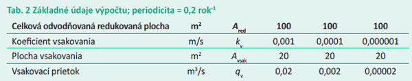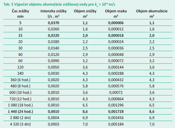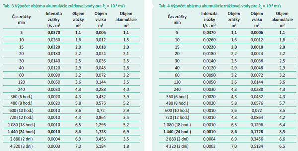 Nová norma [3] obsahuje tabuľky pre hodnoty intenzity zrážok, ktoré sú použité v tab. 3 až tab. 5 tohto článku. V týchto tabuľkách sú určené objemy potrebnej akumulácie v závislosti od koeficientu vsakovania kv. Výpočty sa realizovali pre tri hodnoty koeficientu vsakovania kv a súvisiace hodnoty vsakovacieho prietoku qv pri celkovej odvodňovanej redukovanej ploche 100 m2 a ploche vsakovania 20 m2 (bližšie tab. 2).