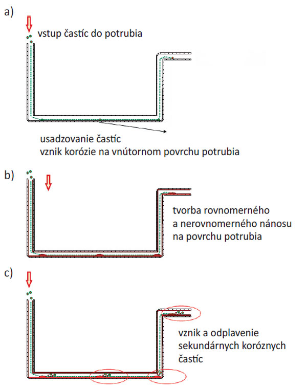 Na obr. 2c vidieť ďalší postup korózie – odplavovanie koróznych častíc a ich usadzovanie v iných miestach systému. Korózne usadeniny sa odplavujú napríklad pri špičkovom odbere vody, keď sa výrazne zvyšuje rýchlosť prúdenia vody oproti nočnému útlmu.