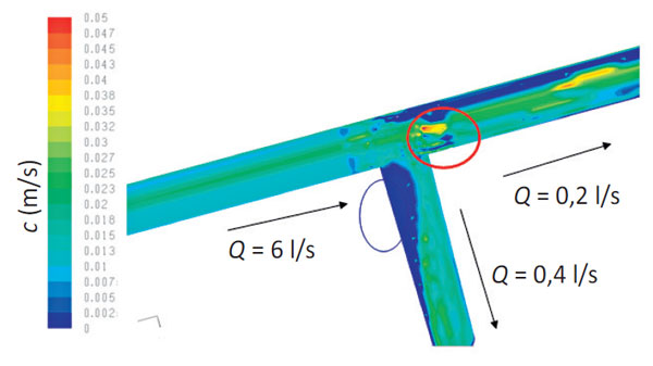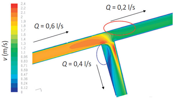 Na obr. 4 sú znázornené výsledky simulácie rýchlosti prúdenia vody pri prietoku 0,6 l/s na odbočke v osi potrubia. Modrou farbou je zobrazená najnižšia rýchlosť prúdenia vody, červenou farbou najvyššia rýchlosť (m/s). V označenej oblasti 1 je nízka rýchlosť prúdenia vody a je tu aj najvyššia koncentrácia usadených častíc, čo vidieť na obr. 5, kde je znázornený výsledok simulácie koncentrácie častíc na vnútornom povrchu potrubia. V oblasti 2 je takisto nízka rýchlosť prúdenia vody, tu sa však neusadzujú častice v dôsledku geometrie potrubia a ani sa neusadzujú častice na hrane zmeny smeru.
