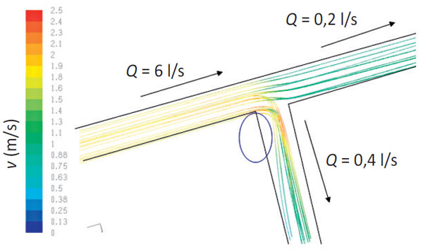 Pohyb častíc sedimentu je vyvolaný silami pôsobiacimi na jednotlivé častice, ktoré sú väčšie ako gravitačné. To znamená, že musíme poznať rozloženie síl pôsobiacich na častice. Na pohyb častíc pôsobí rýchlosť prúdenia vody v systéme, ale aj geometria systému a rozloženie už usadených častíc (obr. 4). Pri vyhodnotení usadzovania častíc v prúdiacej tekutine sa podľa [14] uvádza, že v „tieni usadených častíc“ sa ďalšie častice neukladajú. Na obr. 4 je výsledok simulácie trajektórií prúdiacich referenčných častíc, ktorý potvrdzuje vznik zóny bez usadenín v mieste odbočenia, oblasť 2.