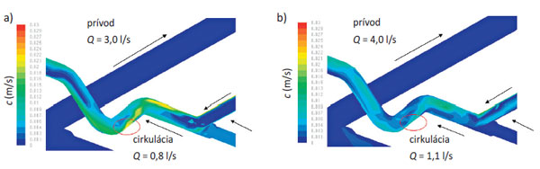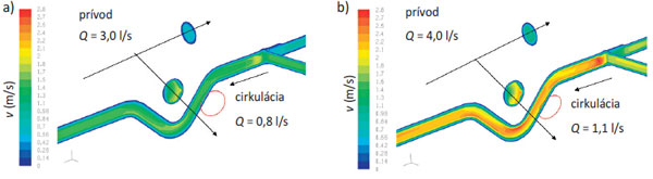 Na obr. 7 je porovnanie rýchlosti prúdenia vody v zhybke na cirkulačnom potrubí pri prietokoch 3,0 l/s (obr. 7a) a 4,0 l/s (obr. 7b). Tmavomodrá farba znázorňuje nulovú rýchlosť prúdenia vody, červená farba predstavuje rýchlosť 2,6 m/s. Vo vyznačenej oblasti 1 s nízkou rýchlosťou prúdenia vody je vysoká pravdepodobnosť usadzovania koróznych častíc.