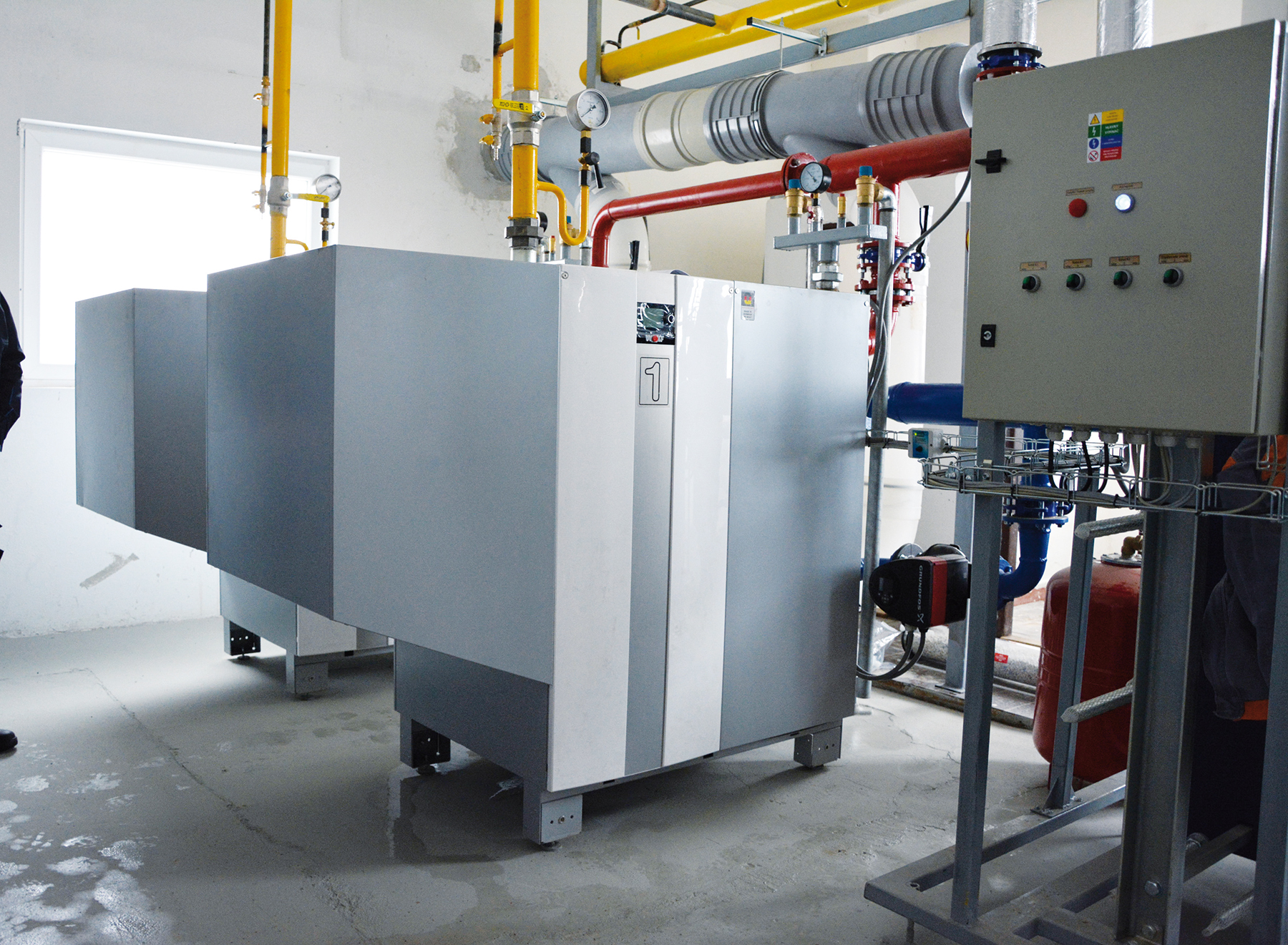 Kotol je vybavený uzatváracími armatúrami, v prípade viacerých kotlov v kaskáde pripojených na spoločný oddeľovací výmenník aj spätnou klapkou vo výstupe každého kotla. Potrubný rozvod je pripojený cez uzatváracie armatúry na primárnu stranu doskového výmenníka tepla. Potrubia sú v prívode aj v spiatočke vybavené priamymi teplomermi. Prietok na sekundárnej strane oddeľovacieho výmenníka tepla zabezpečujú obehové čerpadlá vykurovacej sústavy.