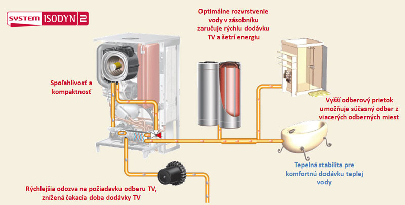 V kotloch Tiger Condens so systémom zabudovaných zásobníkov z nehrdzavejúcej ocele je použitá patentovaná technológia ISODYN2. Toto riešenie umožňuje kotlom Tiger Condens zabezpečiť také množstvo teplej vody ako kotlom so samostatným veľkým zásobníkom. Výhody systému ISODYN2 môžeme porovnať s externým zásobníkom s objemom 200 l. Pri rovnakom komforte dodávky teplej vody sú tepelné straty o 10 % nižšie. Úspora energie za 1 rok sa rovná energii potrebnej na ohrev 860 l vody s teplotou 50 °C.