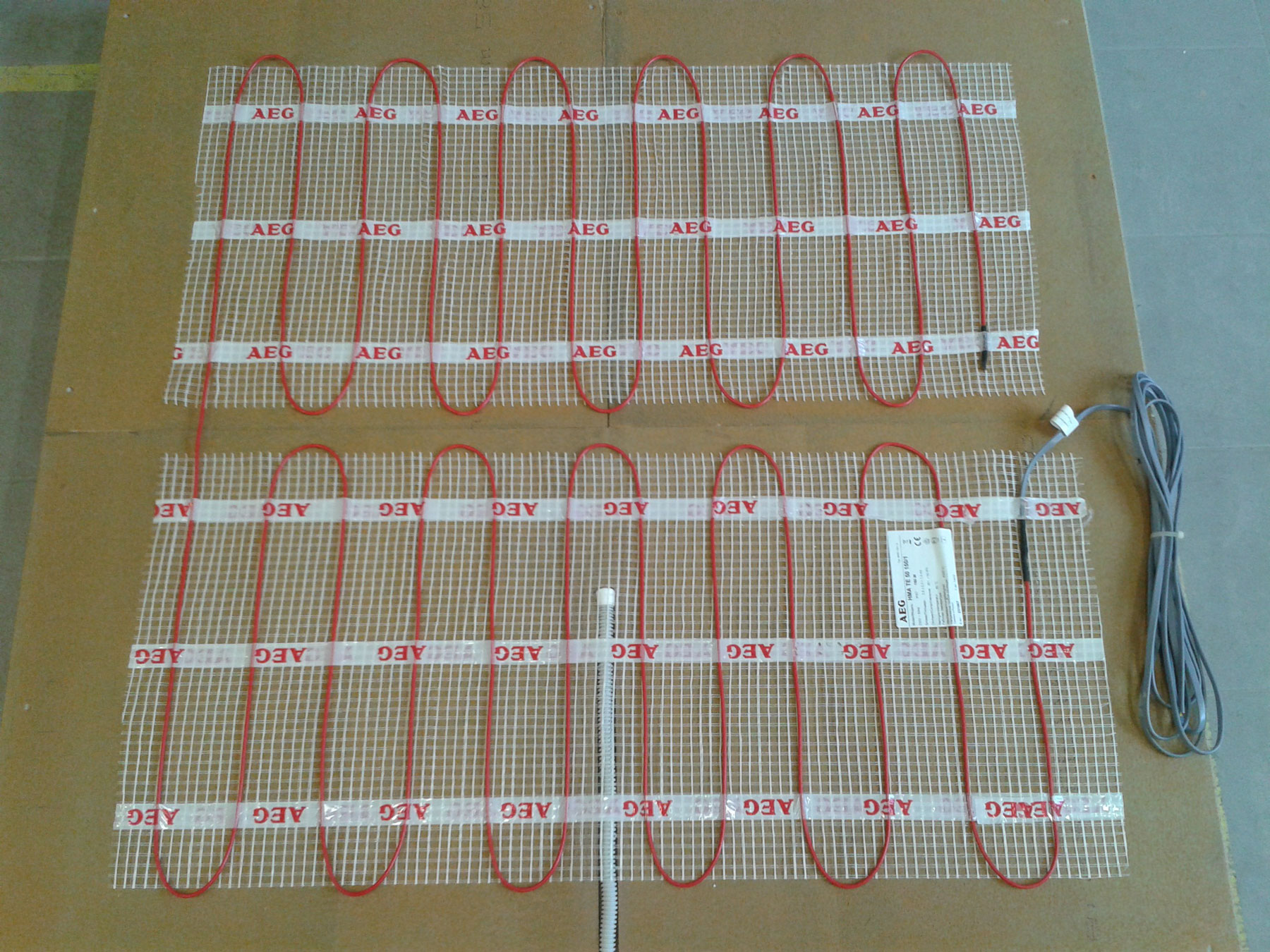 V mieste umiestnenia regulátora elektrickej rohože sa v podlahe kolmo od steny vyreže drážka na aplikáciu podlahového čidla. Teplotné čidlo bude v ohybnej ochrannej hadici, prípadne v tzv. husom krku vo vzdialenosti 500 mm kolmo od steny. Hĺbka drážky sa odporúča 20 mm do podlahy, aby nedošlo k zbytočnému vyvýšeniu podlahy pri povrchovom kladení krytiny. Na rovný čistý napenetrovaný povrch sa položí elektrická vykurovacia rohož AEG model HMA TE 50 150. Ide o podlahové vykurovanie s výkonom 150 W/m², šírka rohože je 500 mm. V inštalačnej krabici je potom nutné pripojiť studený napájací koniec rohože, teplotné čidlo a prívod el. napätia 230 V k regulátoru AEG FTD 730.
