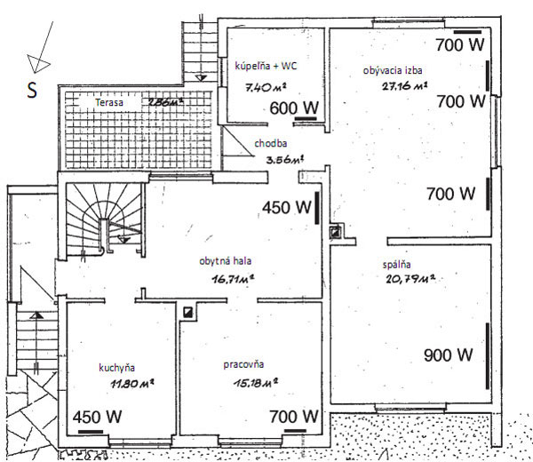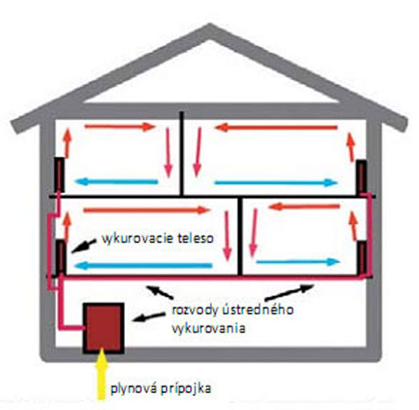 Zvolil sa najrozšírenejší typ centralizovaného plynového vykurovania typického pre starú zástavbu. Zdrojom tepla bol centrálny plynový kotol umiestnený v nevykurovanom pivničnom priestore. Okruhy s teplonosnou látkou viedli do jednotlivých miestností, kde boli napojené vykurovacie telesá s regulačnými ventilmi. Zemný plyn bol do domu privedený plynovým potrubím. Straty pri preprave vedením z plynárne k domovej prípojke sa nezohľadňovali. Tepelná energia sa pri tomto systéme odovzdáva do obytných priestorov prevažne konvekciou (obr. 1). Vznikajúce prúdenie vzduchu vytvára veľký teplotný rozdiel medzi hornou a spodnou časťou miestnosti.