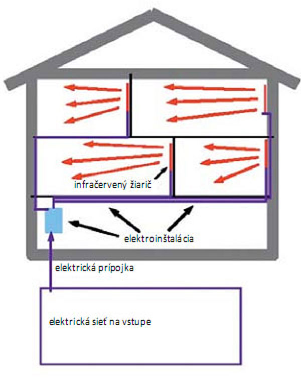 Na stenách miestností – podobne ako zavesené obrazy – sa inštalovali plošné infračervené žiariče na báze odporových fólií bez akumulačnej hmoty, ktoré sa pripojili na sieť domovej elektroinštalácie. Pritom sa bral ohľad na zaťaženie jednotlivých okruhov siete a v prípade potreby sa nainštalovali nové vedenia.