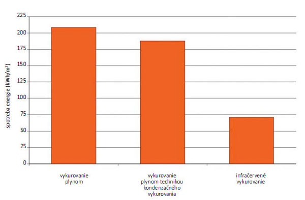 Hodnoty spotreby vztiahnuté na obytnú plochu znázorňuje obr. 6. V pomere k nízkoteplotnému vykurovaniu plynom tvorí spotreba konečnej energie infračerveného vykurovania len 34,1 %, v pomere k vykurovaniu plynom s technikou kondenzačného vykurovania len 37,9 %. To znamená, že spotreba konečnej energie vykurovania plynom bola viac než 2,5-krát vyššia než pri infračervenom elektrickom vykurovaní.