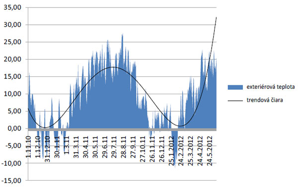 Základným predpokladom na určenie energetickej účinnosti kotlov je určenie tzv. sezónnej účinnosti zdroja tepla. Na potreby merania a výpočtu účinnosti možno zvoliť rôzne intervaly merania (ak sa vykonáva prevádzkové hodnotenie zdroja tepla). Na tieto účely sa do grafu na obr. 1 spracovali hodnoty vonkajších klimatických údajov od Slovenského hydrometeorologického ústavu (SHMÚ). Na základe nižšie uvedených okrajových podmienok (zvolených intervalov exteriérovej teploty) sa potom určila početnosť dní s konkrétnou teplotou (°C) v priemernom roku takto :