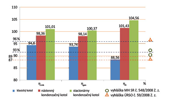 Druhú podmienku spĺňa zase kotolňa s kondenzačnými stacionárnymi kotlami, v ktorej sú nainštalované kotly s menovitým výkonom jedného kotla 142 kW. Na objekt so závesnými kondenzačnými kotlami s menovitým výkonom jedného kotla 99,5 kW sa vzťahujú požiadavky vyhlášky MHSR. Požiadavky na energetickú účinnosť podľa vyhlášky MHSR č. 548/2008 Z. z. sú pri vyššie uvedených okrajových podmienkach pre kondenzačné kotly 93 % a pre klasické kotly 89 %. Je však nevyhnutné dodať, že energetická účinnosť sa má stanoviť vhodnou metodikou prevádzkového hodnotenia kotla, pričom sa odporúča metodika podľa STN EN 15378. Tá bola obsahom predošlých kapitol, pričom výsledky zobrazuje práve graf na obr. 3, a to konkrétne v prostrednom stĺpci označenom ako ηgen.