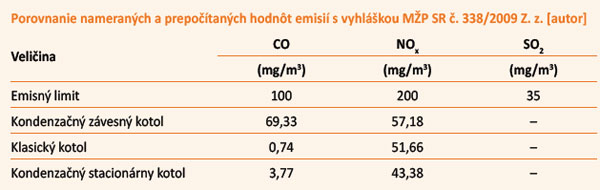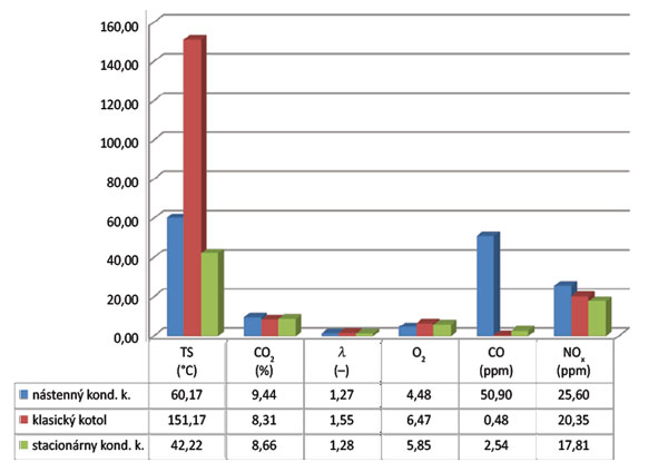 Najlepšie obstál stacionárny kondenzačný kotol, ktorý vykazuje najnižšie hodnoty emisií medzi skúmanými objektmi a zároveň najlepšiu energetickú účinnosť. Je to sčasti spôsobené aj nízkoteplotným vykurovaním, na ktoré je kotol napojený, zároveň však aj sálavým horákom novej generácie, ktorý má nízke hodnoty spalín a emisií. V tabuľke sú hodnoty porovnané s emisnými limitmi definovanými v zákone o ovzduší č. 137/2010 Z. z. a v jeho vykonávacej vyhláške MŽP SR č. 338/2009 Z. z.