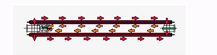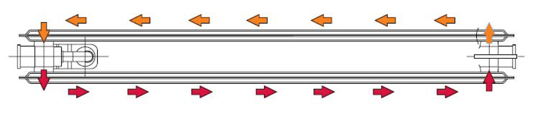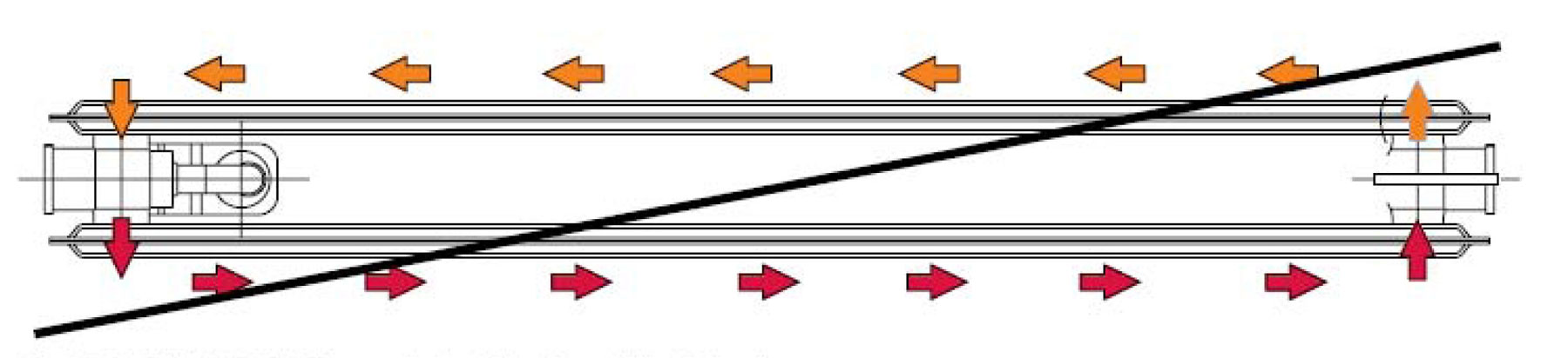 Významný rozdiel medzi teplotou predného a zadného panela sa pri sériovom natekaní prejaví pri nábehu, t. j. pri ohrievaní telesa. Za približne 15 minút sa radiátor rovnomerne prehreje, pričom rozdiely teplôt medzi predným a zadným panelom sa znížia (obr. 2). Konštruktéri spoločnosti KORADO meraním zistili, že pri bežných teplotných pomeroch v prechodnom období sa tepelný výkon zadného panela so sériovým natekaním výrazne znižuje a že vynechaním zadného panela sa výkon telesa zmení. Výsledkom úvah je panelový radiátor RADIK s riadeným natekaním, v prípade ktorého si možno zvoliť, či bude vykurovacia voda pretekať len čelným panelom alebo obomi panelmi. Ide pritom o paralelné pretekanie, teda s nižšou hydraulickou stratou. (obr. 3)