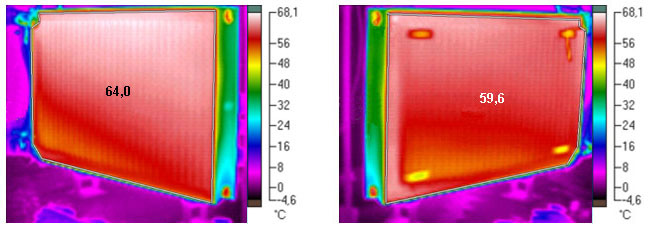 Voľba aretačnej objímky hlavice ventilu umožňuje jeho nastavenie podľa toho, ktorý panel bude pri montáži radiátora zvolený ako čelný. Na overenie vlastností telesa RADIK sa zvolili prakticky identické počiatočné podmienky ako pri radiátore so sériovým natekaním. Pri plnom paralelnom natekaní do oboch panelov bol prietok oproti sérovému zapojeniu mierne väčší. Režim natekania sa potom rozdeľovacím ventilom prepol len na čelný panel. To viedlo k trvalému zvýšeniu strednej teploty čelného panela (obr. 5), čím sa zvýšil sálavý tok tepla. Prepnutím natekania len do čelného panela poklesol menovitý výkon telesa na približne 73 %. Radiátor tým získal dve výkonové hranice: 100 % a 73 %, ktoré možno nastaviť „hardvérom“ radiátora, teda rozdeľovacím ventilom.
