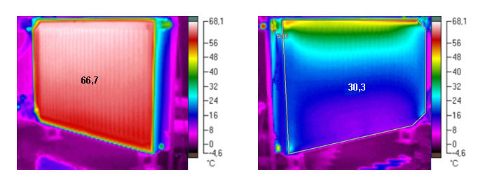 (Obr. 5) Radiátor RADIK s riadeným natekaním, pretekanie len čelným panelom; čelný panel spredu, zadný panel zozadu