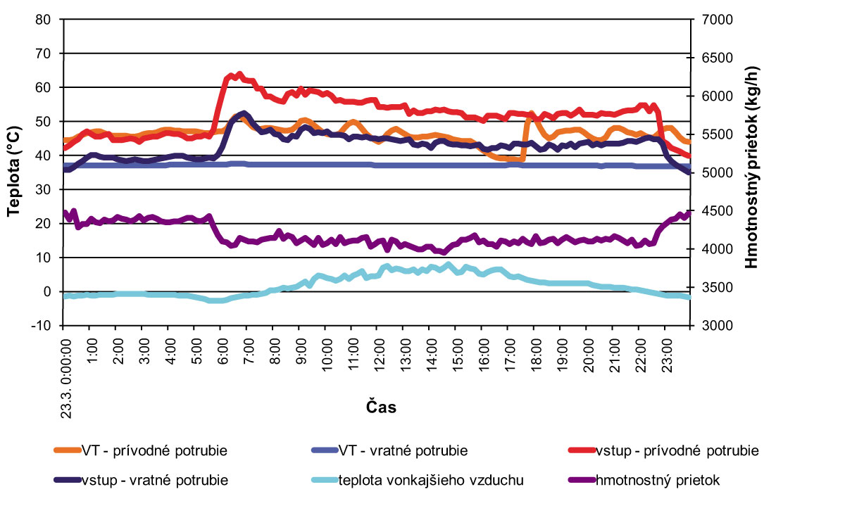 Na porovnanie prevádzky vykurovacej sústavy s nočným útlmom sa vykonali merania na vykurovacej sústave dvoch objektov, z ktorých jeden bol v pôvodnom stave a druhý po obnove obalových konštrukcií. Obidva objekty sú z typologického hľadiska rovnaké, ide o 8-podlažný bodový bytový dom. Vykurovacia sústava je dvojrúrová so spodným rozvodom s vetvovým systémom a je hydraulicky vyregulovaná. Vykurovacia sústava je priamo napojená na sústavu CZT. Na vykurovacej sústave sa vykonali merania týchto fyzikálnych parametrov: Na vstupe do vykurovacej sústavy sa merali teploty prívodnej a vratnej vykurovacej vody a hmotnostný prietok, ďalej na najvyššom 8. podlaží sa merali teploty prívodnej a vratnej vykurovacej vody pred vykurovacím telesom (VT) a teplota vzduchu v interiéri. Takisto sa merala teplota vonkajšieho vzduchu. Priebeh nameraných teplôt a hmotnostných prietokov je na obr. 3 a 4.