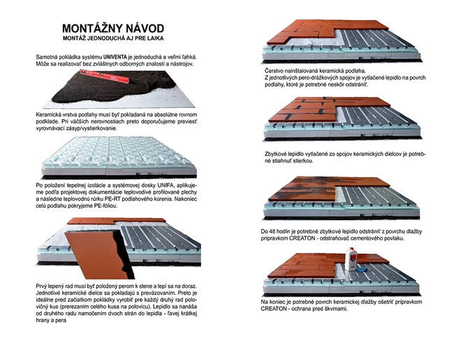 Systém suchej podlahovky pozostáva z polystyrénovej systémovej dosky UNIFA s drážkami, do ktorých sa založia plechové profily slúžiace na odvod tepla od rúrky do vrchnej vrstvy podlahy. Do plechových profilov sa vtlačí rúrka, určená pre podlahové kúrenie. Táto je pripojená k rozdeľovaču podlahového kúrenia. Ako teplovodivé médium je použitá voda z kotla alebo iného zdroja tepla. Nosná časť podlahy (pod vrchnou krytinou), ku ktorej priliehajú teplovodivé plechy, môže byť vyhotovená buď použitím: