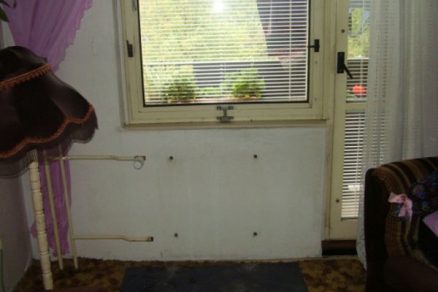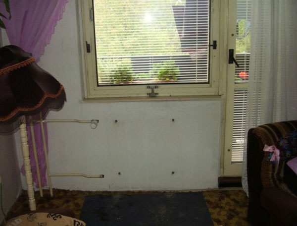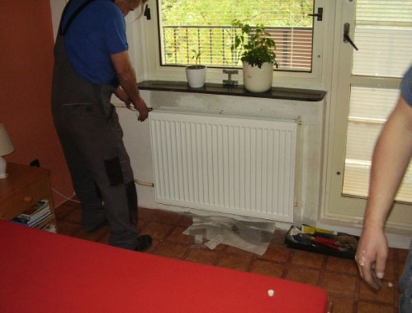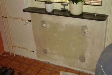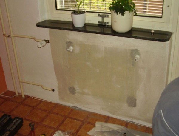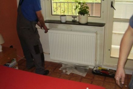 Prvým krokom je vypustenie vykurovacieho telesa. Nasleduje demontáž starého telesa, čo nie je náročné. Tento radiátor bol k stene pripevnený na oceľových závesoch, ktoré treba odstrániť. Naši partneri používajú na odrezanie masívneho kovu mečové píly. Ich výhodou oproti kotúčovým brúskam je menšie lokálne znečistenie. Stenu treba upraviť (zatmeliť či zasadrovať do roviny a určite aj vymaľovať, veď kedy budeme mať opäť príležitosť dostať sa takto pohodlne za radiátor).