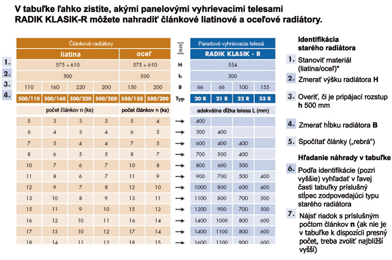 Výber radiátora je veľmi jednoduchý. Potrebujeme poznať rozmery a následne počet rebier radiátora, ktorý chceme nahradiť. V tabuľke uvedenej nižšie si nájdete váš súčasný radiátor a k nemu zodpovedajúci panelový radiátor. Ak si nie ste istí, nie je nič jednoduchšie, ako sa obrátiť na niektorého nášho odborníka, prípadne spoločnosť, ktorá v mieste vášho bydliska vykonáva montáž nových radiátorov. S výberom vám pomôže naša internetová prezentácia, ktorú nájdete na www.korado.cz . Na tejto stránke si môžete vybrať aj farbu radiátora, pretože už dávno neplatí, že radiátor je iba biely.
