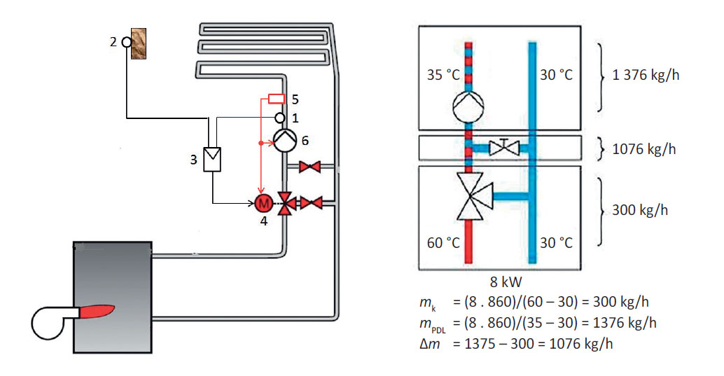 Obr. 1 Regulácia teploty vykurovacej vody podľa vonkajšej teploty – podlahové vykurovanie ako základný zdroj tepla [3], 1 – snímač teploty vykurovacej vody, 2 – snímač vonkajšej teploty, 3 – regulátor, 4 – trojcestný regulačný ventil s pohonom, 5 – priestorový termostat, 6 – havarijný termostat mk – hmotnostný prietok primárneho okruhu, mPDL – hmotnostný prietok okruhu podlahového vykurovania, ∆m – hmotnostný prietok trvalo prepúšťaný skratom