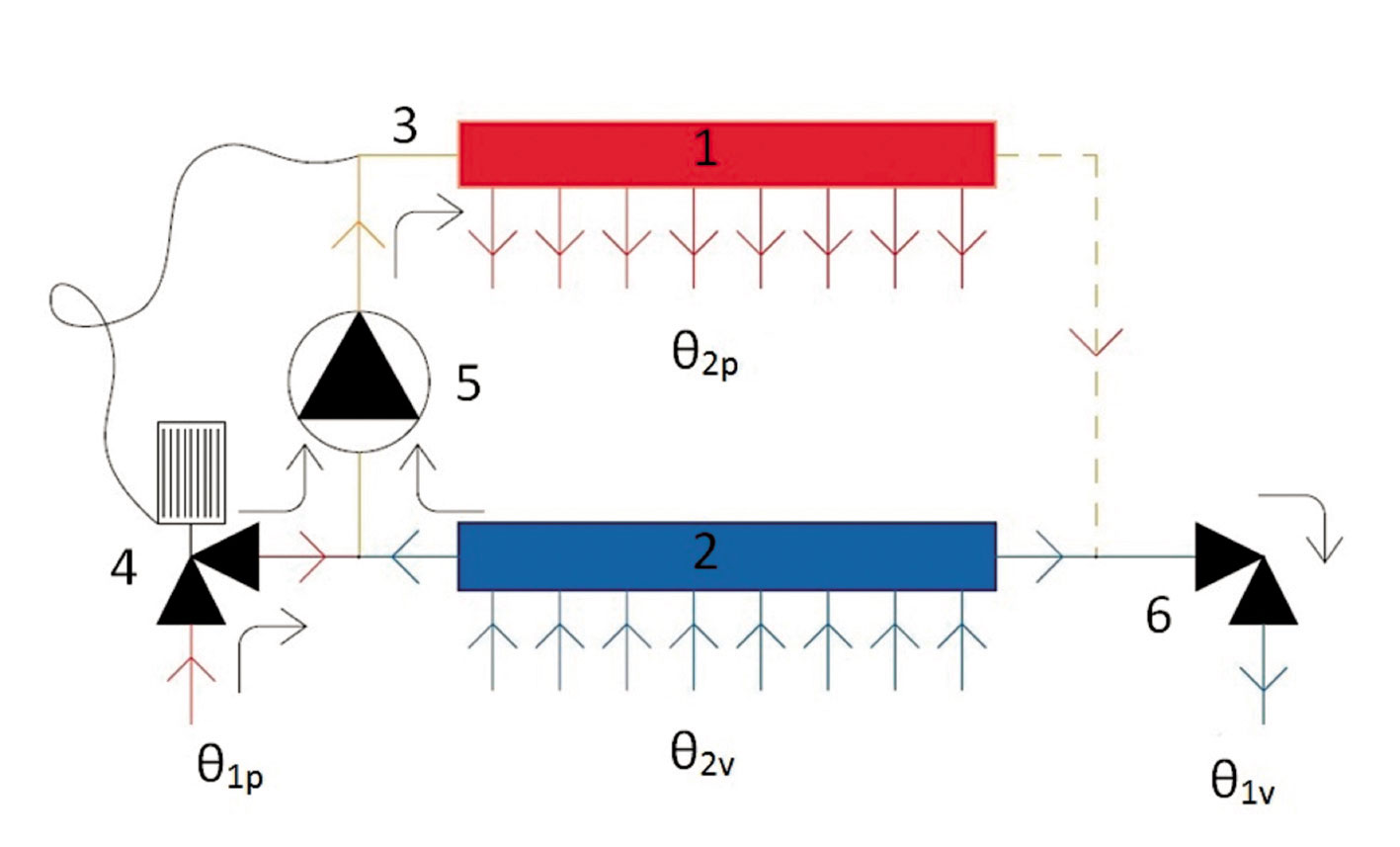 Obr. 10 Rozdeľovač podlahového vykurovania so zmiešavacou funkciou [5], 1 – rozdeľovač podlahových okruhov, 2 – zberač podlahových okruhov, 3 – snímač teploty vykurovacej vody, 4 – dvojcestný regulačný ventil s termostatickou hlavicou a oddeleným snímačom teploty, 5 – čerpadlo, 6 – regulačné skrutkovanie, θ1p – teplota prívodnej vody primáru, θ1v – teplota vratnej vody primáru, θ2p – teplota prívodnej vody podlahových okruhov, θ2v – teplota vratnej vody podlahových okruhov